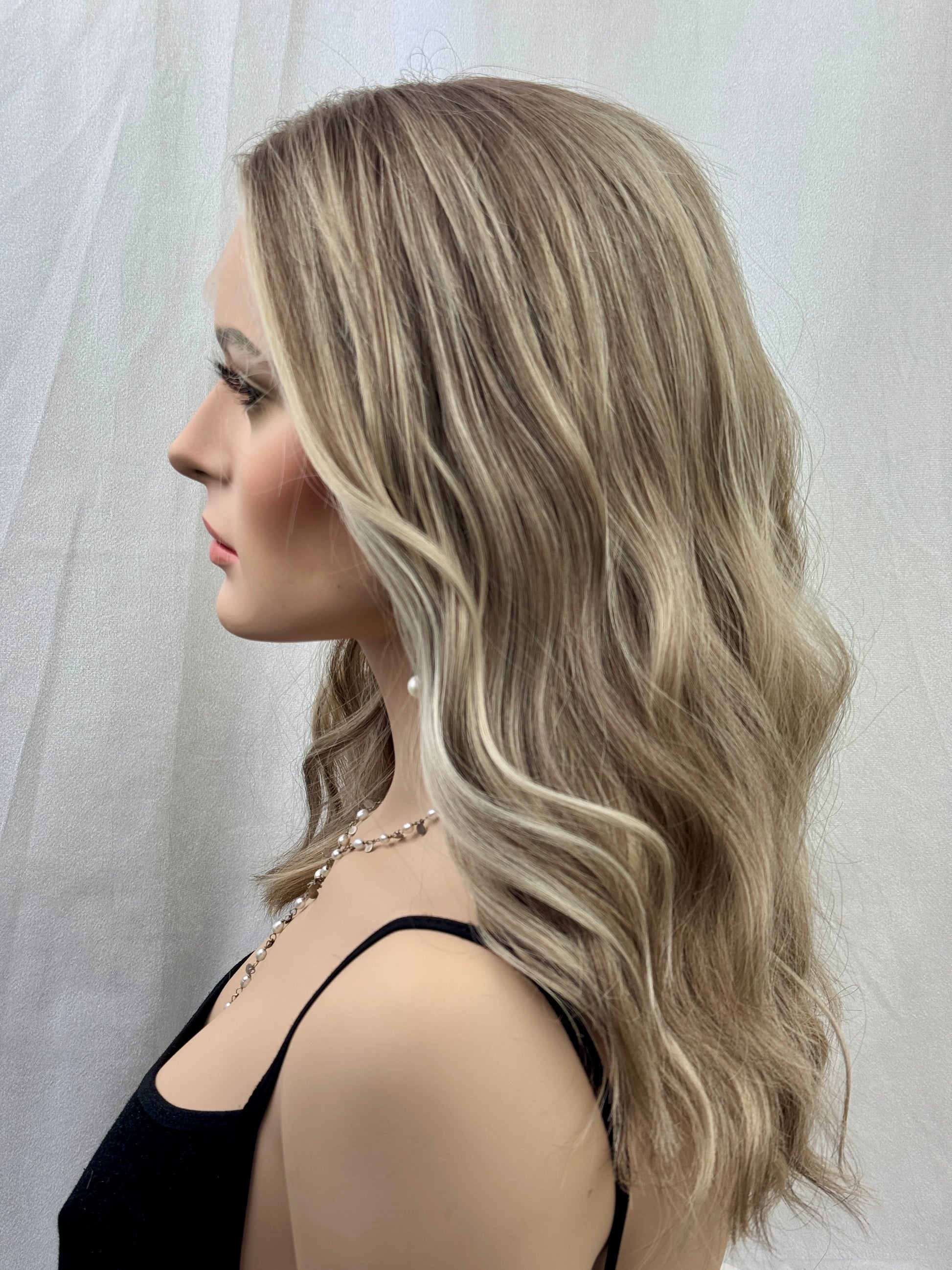 - Color description: dimensional “Bronde” lightest blonde color is 9/10 level and root is a level 6/7; overall it is a cool to neutral Bronde; the hairline is has single knots in a light blonde with invisible knots.