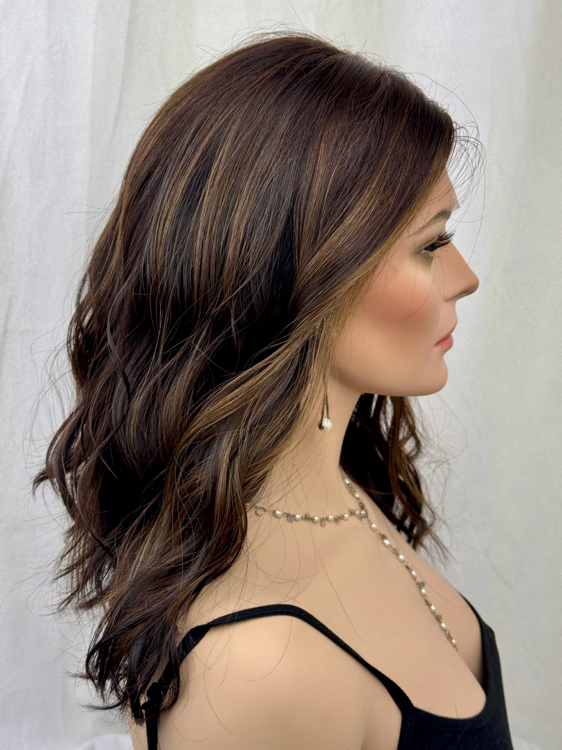 - Color description: dark brown (2) with warm/gold brown highlights (6) and “money piece” lighter highlights towards the front (8), the knots have been gently bleached