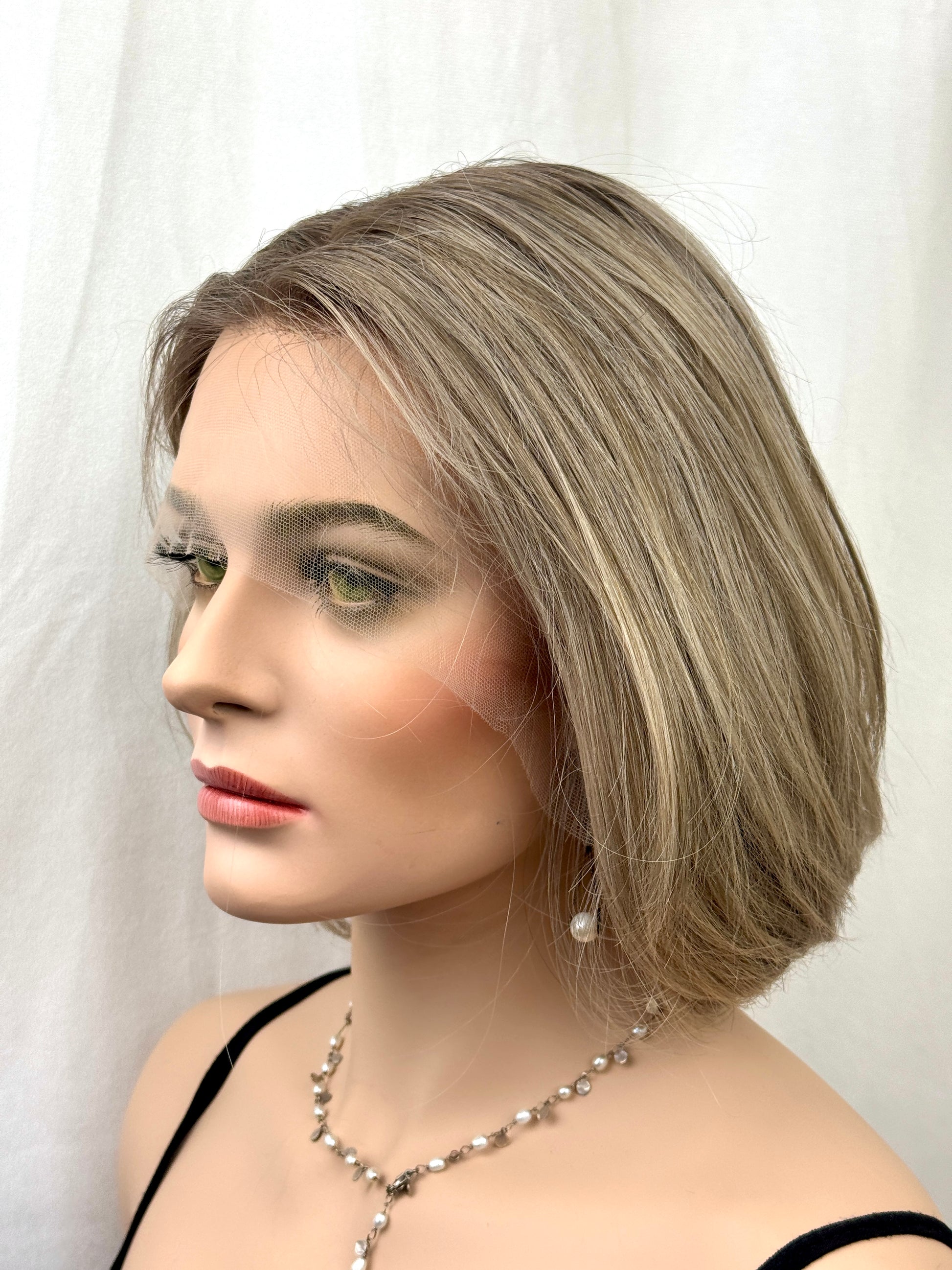 - cap construction: lace top with transparent lace from ear to ear and a silk silicone liner inside the lace top. There are ear tabs silicone , the back is wefted and the nape has silicone on the inside of the cap. There are size adjusters in the nape. The hair density is approximately 120-130