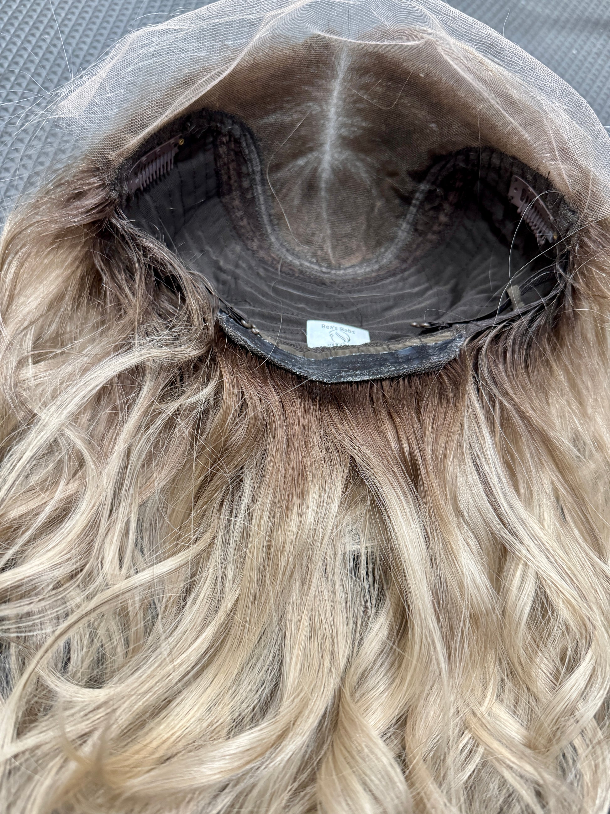 - Color description: this is a cool blonde (level9) with a neutral to ashy root reverse balayage ( level 7). The knots have been gently bleached for a more realistic part and hairline