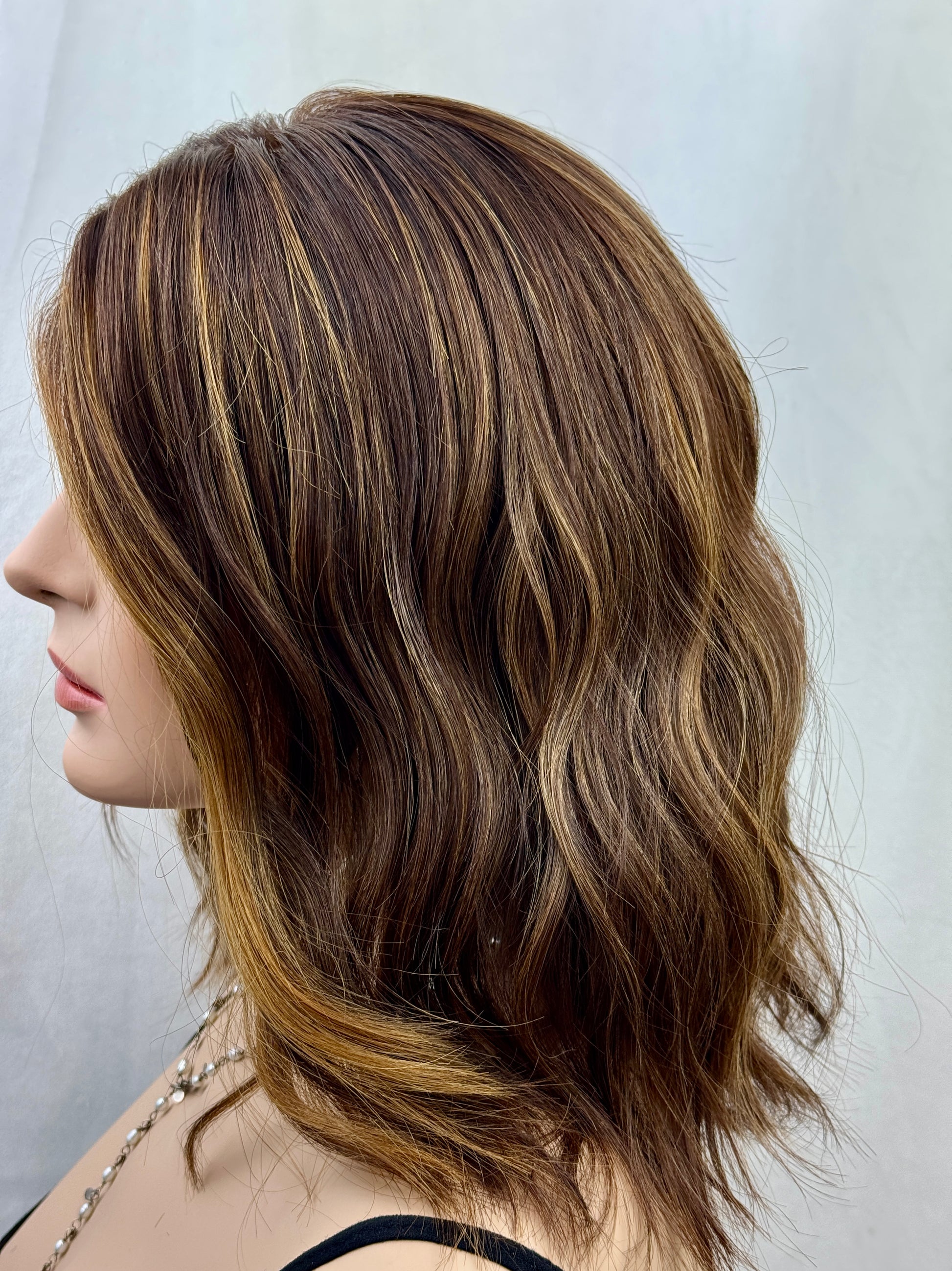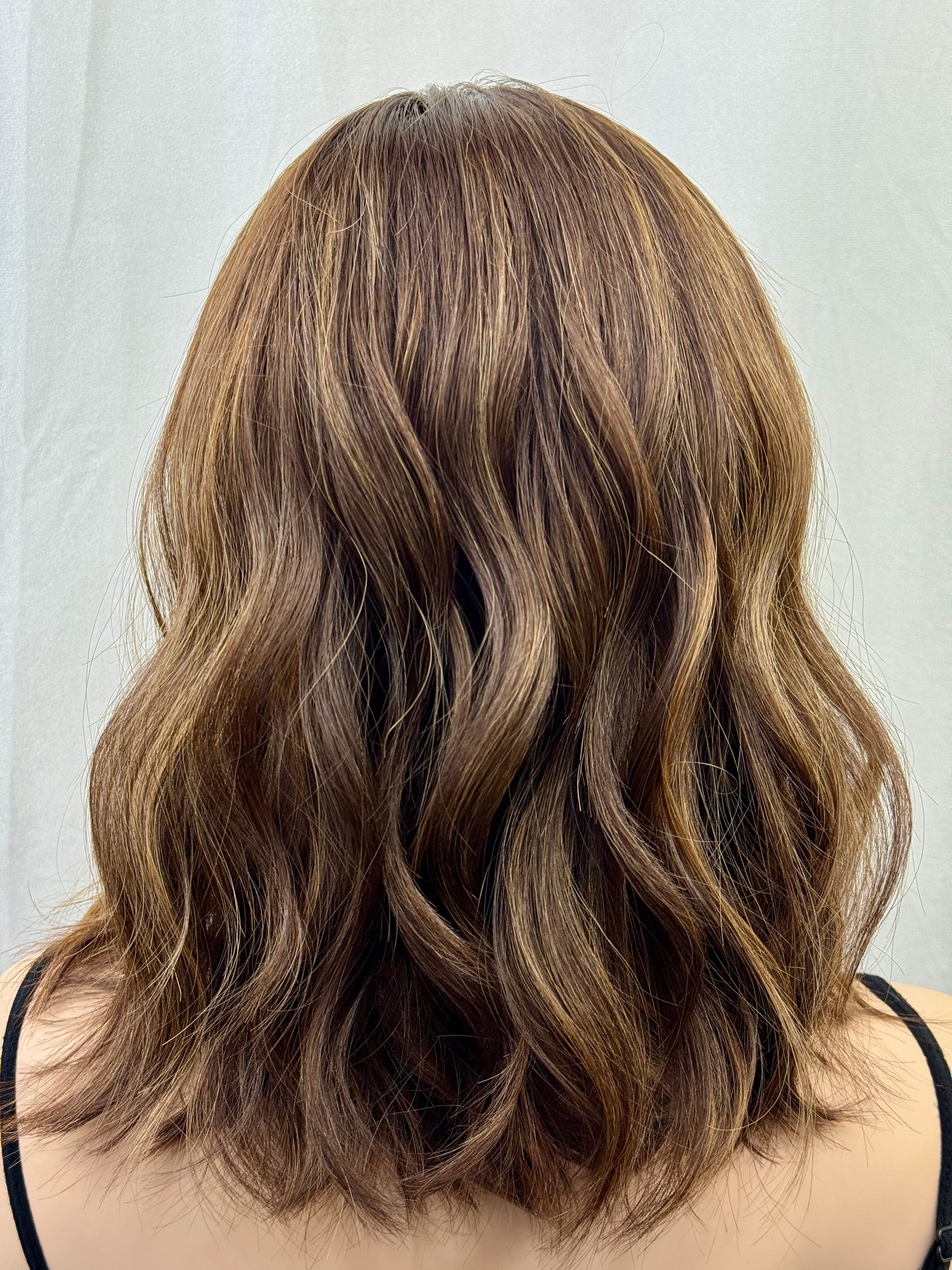 - Color description: the root and base are a level 4 warm medium brown, the highlights are caramel (golden dark blonde) the knots have been gently bleached in the lace front
